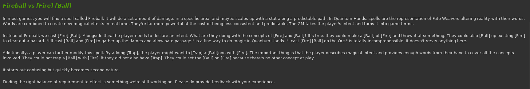 Words of Power allows for exceptionally strong magic with minimal investment. Players are able to combine words like [Permanent] and [Silence] to mute a person forever. [Dispel] can wipe away even such powerful magicks. Fate Weavers literally rewrite reality in real time. Your job as a Storyteller is to fulfill the intent and then weave it into a story that makes sense.